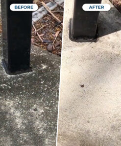 Generally, a minimum of 20 minutes on walls and shower mould, grout etc… If possible, for outdoor concretes and driveways leave on the surfaces for a minimum of an hour but, if able, leave it for the weather to remove.
